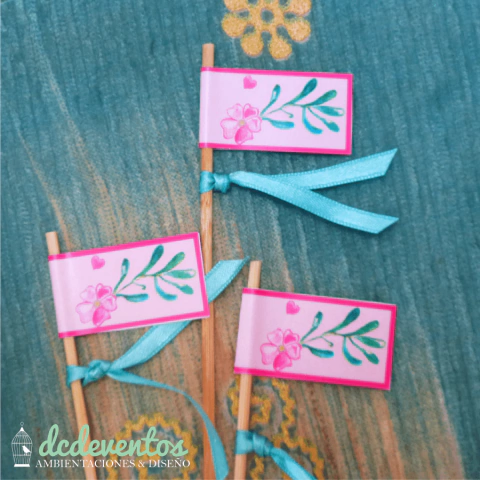*Banderitas con mensaje y/o nombre para colocar en las mesas, la mesa dulce y/o del candy bar.